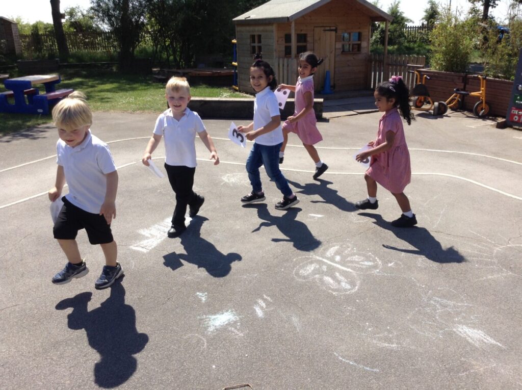 In Maths the children played a game outside where they had to match the correct numeral to the right number of dots. They had to dance, skip, hop or jump and when the tambourine shook they had to find their partner with the numerals and dots that matched.