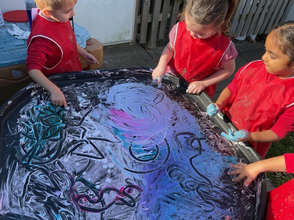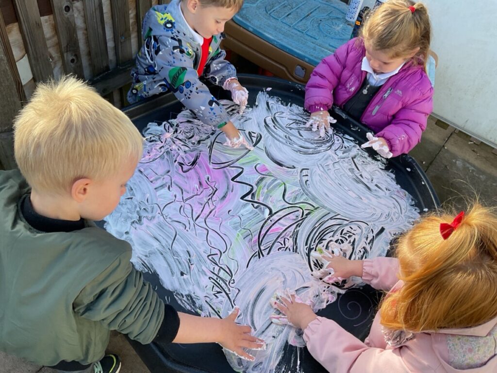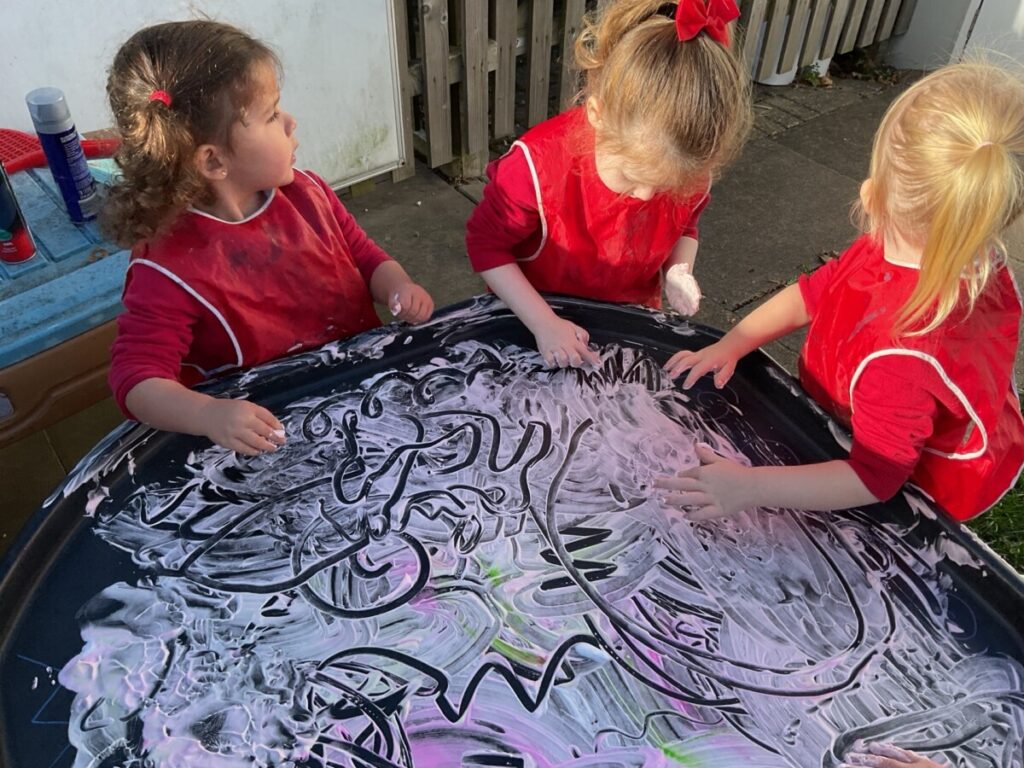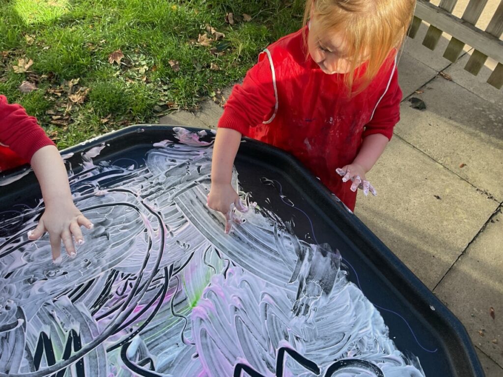 Nursery Blog Messy mark making in Nursery Today we used shaving foam and food colouring to draw different shapes and patterns in the shaving foam. As you can see, we had lots of fun!