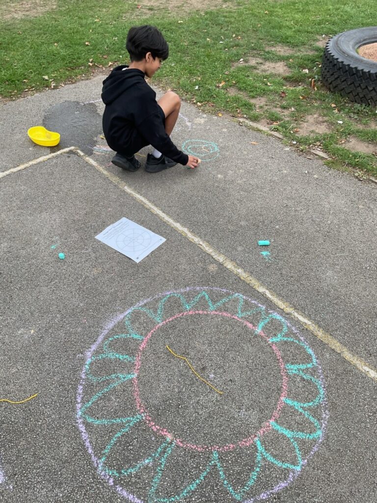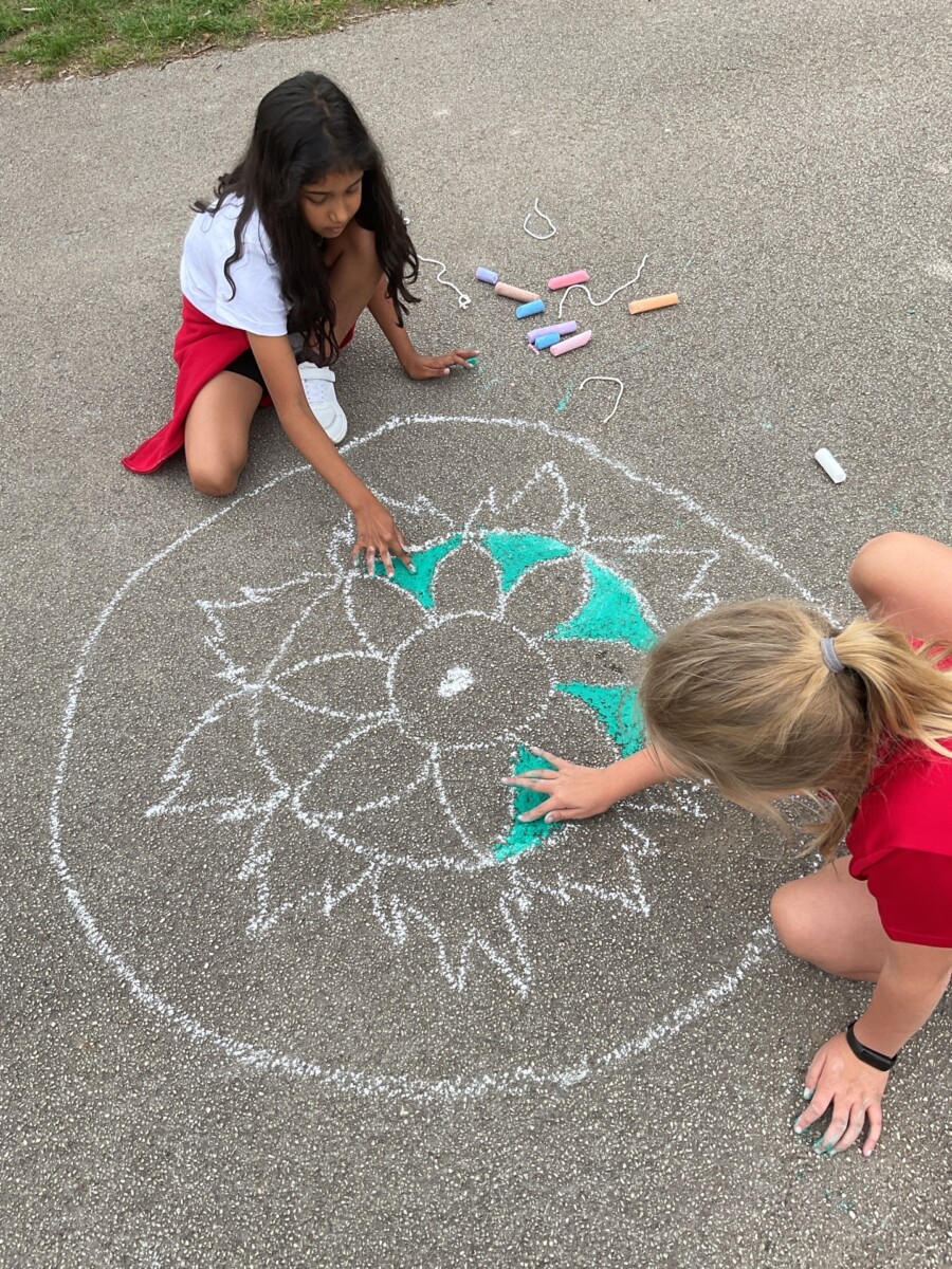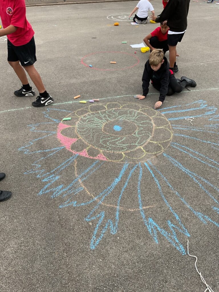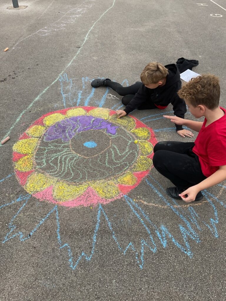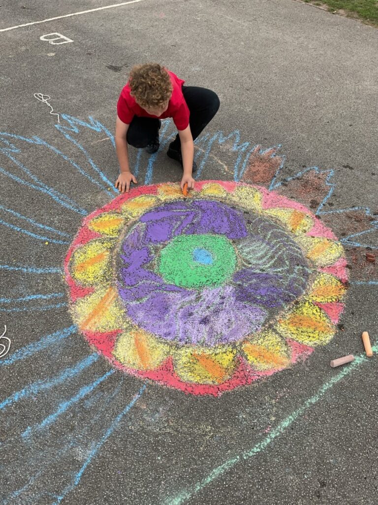 Children begin with a central point, then work outwards in rings—adding shapes, petals, and patterns in bold colours. Some mandalas are created individually, while others grow into large group projects that stretch across the playground. Each one is unique, and although the rain eventually washes them away, these chalk mandalas remind us that creativity doesn’t have to be permanent to be powerful.