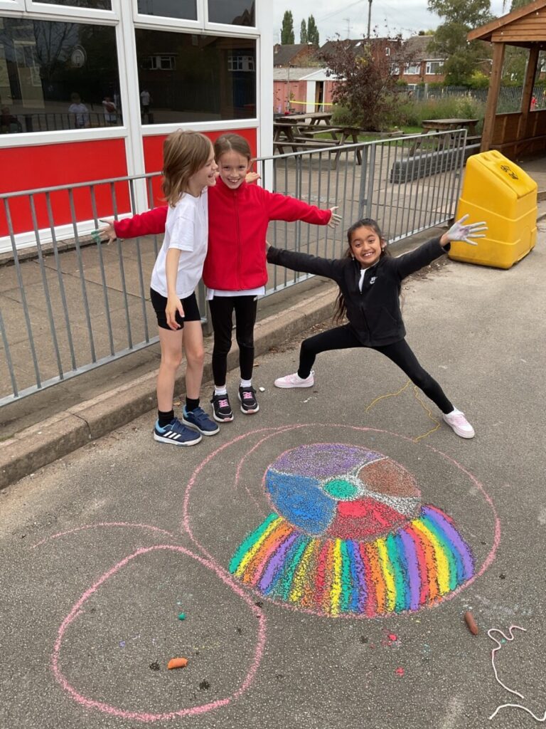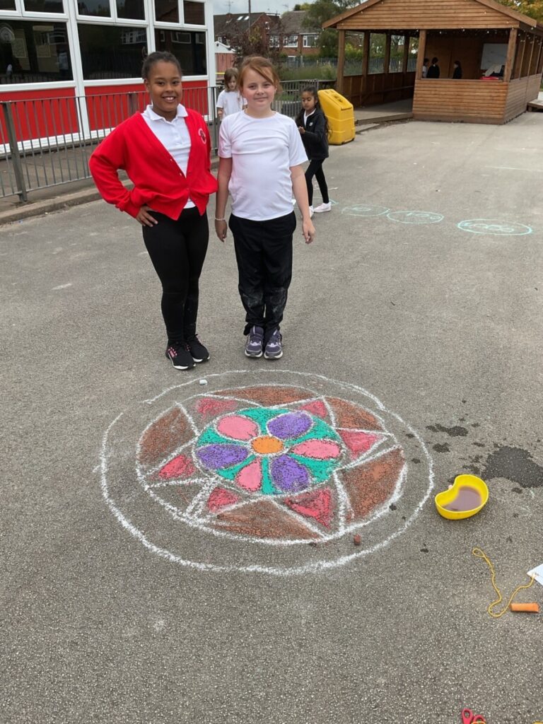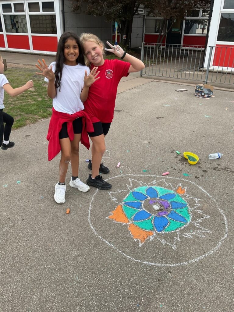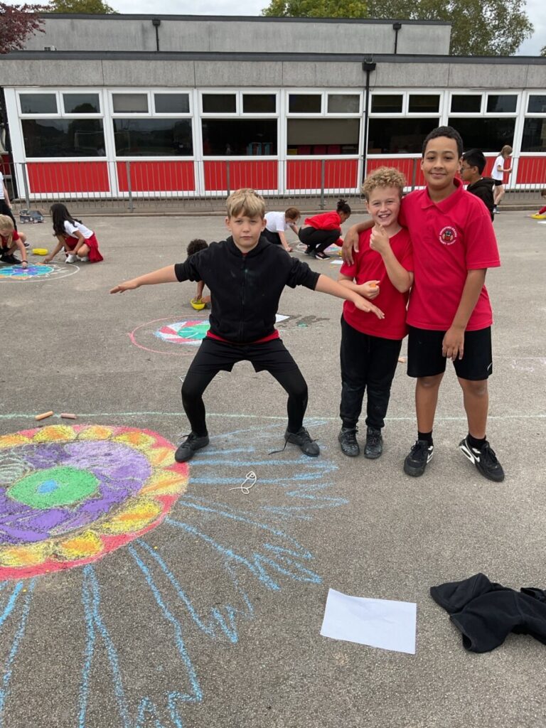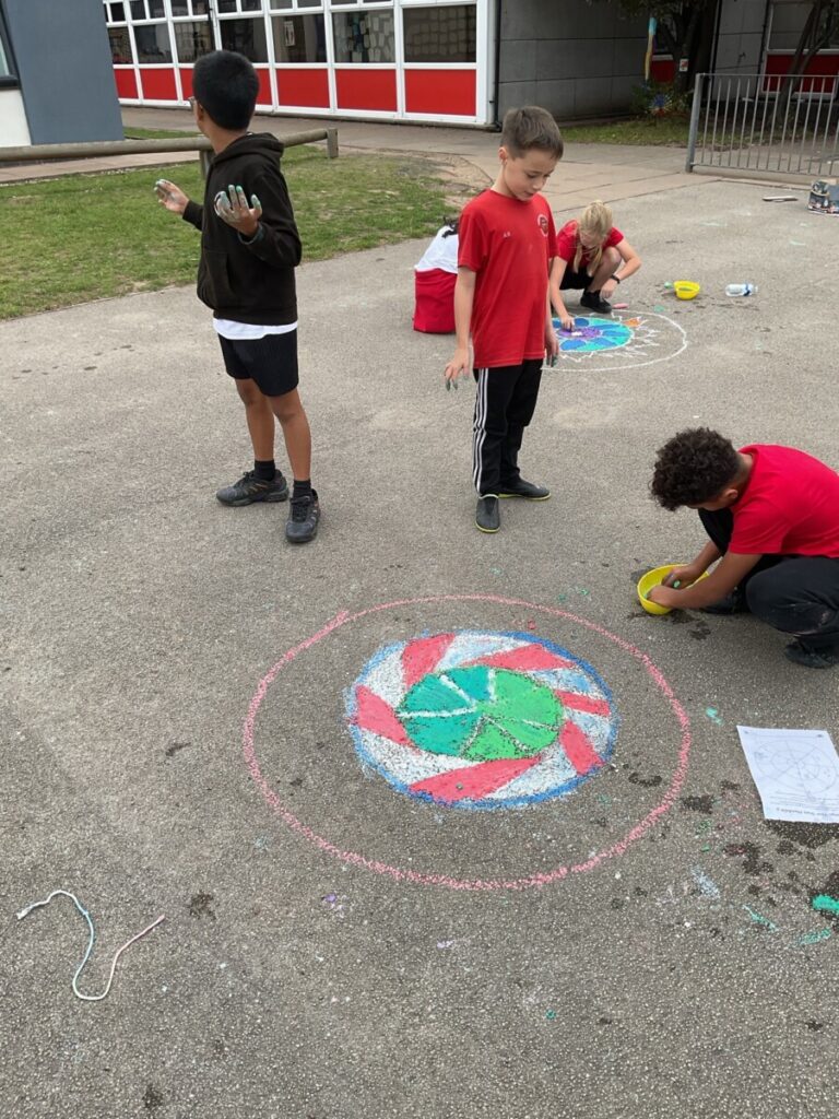 Children begin with a central point, then work outwards in rings—adding shapes, petals, and patterns in bold colours. Some mandalas are created individually, while others grow into large group projects that stretch across the playground. Each one is unique, and although the rain eventually washes them away, these chalk mandalas remind us that creativity doesn’t have to be permanent to be powerful.