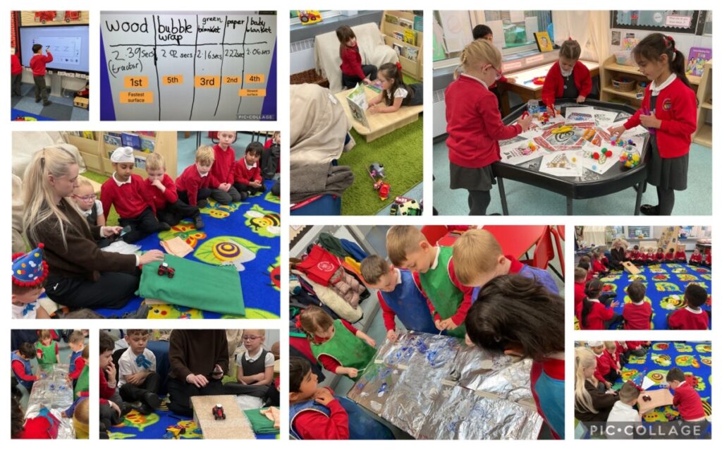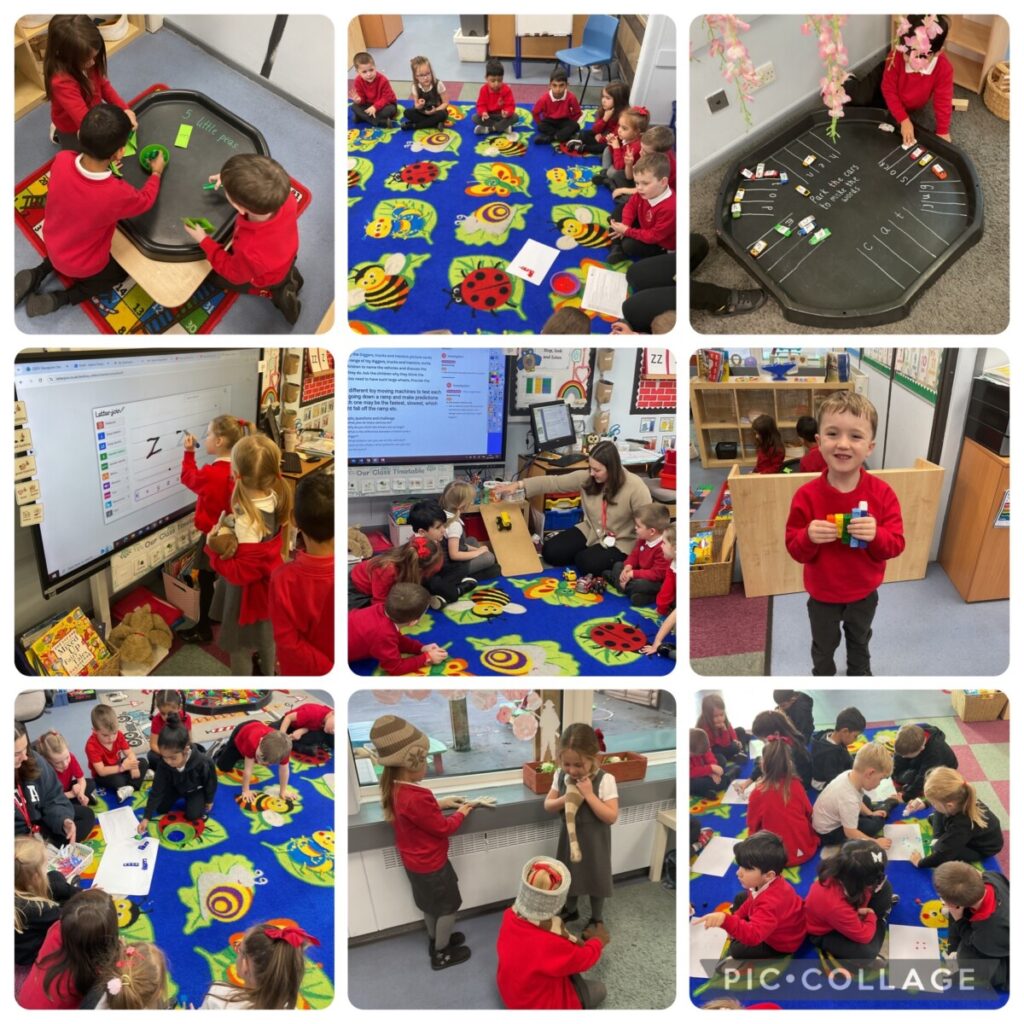 This week we learnt the sounds -z, -zz, -qu, plurals with -s and -ch and tricky words no, go, to and into. In maths we consolidated our knowledge of part and whole numbers by looking at the composition of three, four and five practically. In other areas we completed some science experiments using different vehicles on different surfaces. We also looked at transport through the ages and thought about vocabulary past and present. The children enjoyed making wintery patterns on foil in the creative area and using their phonics and maths knowledge in busy learning time. Letter formation has also been a area of focus.