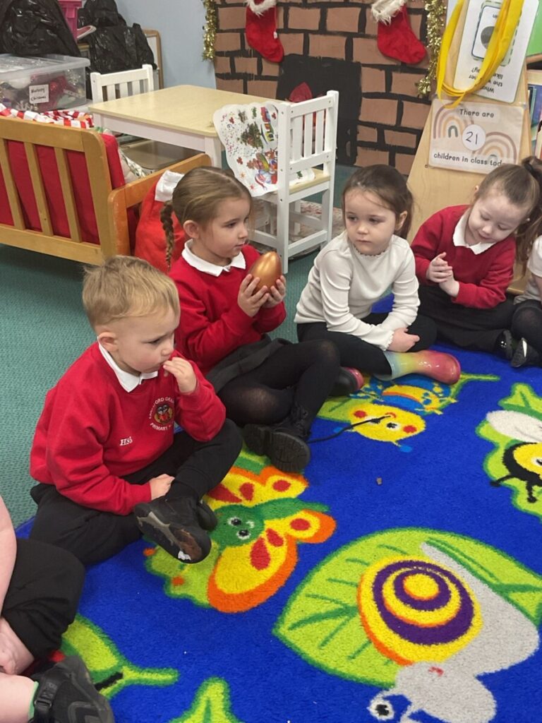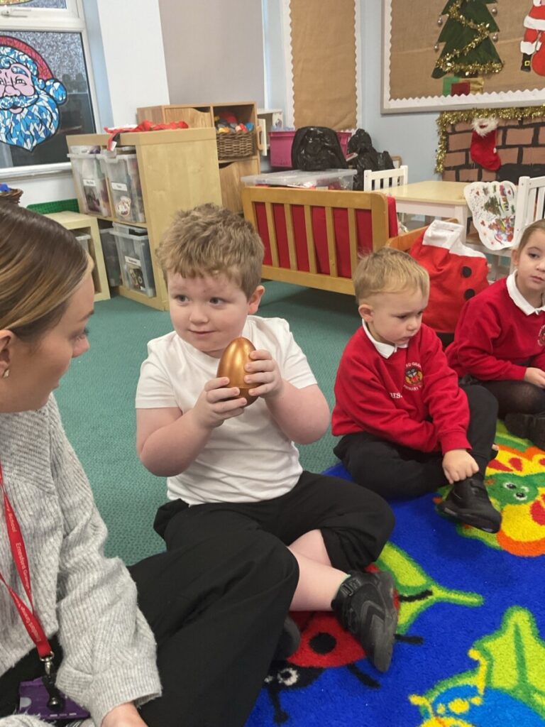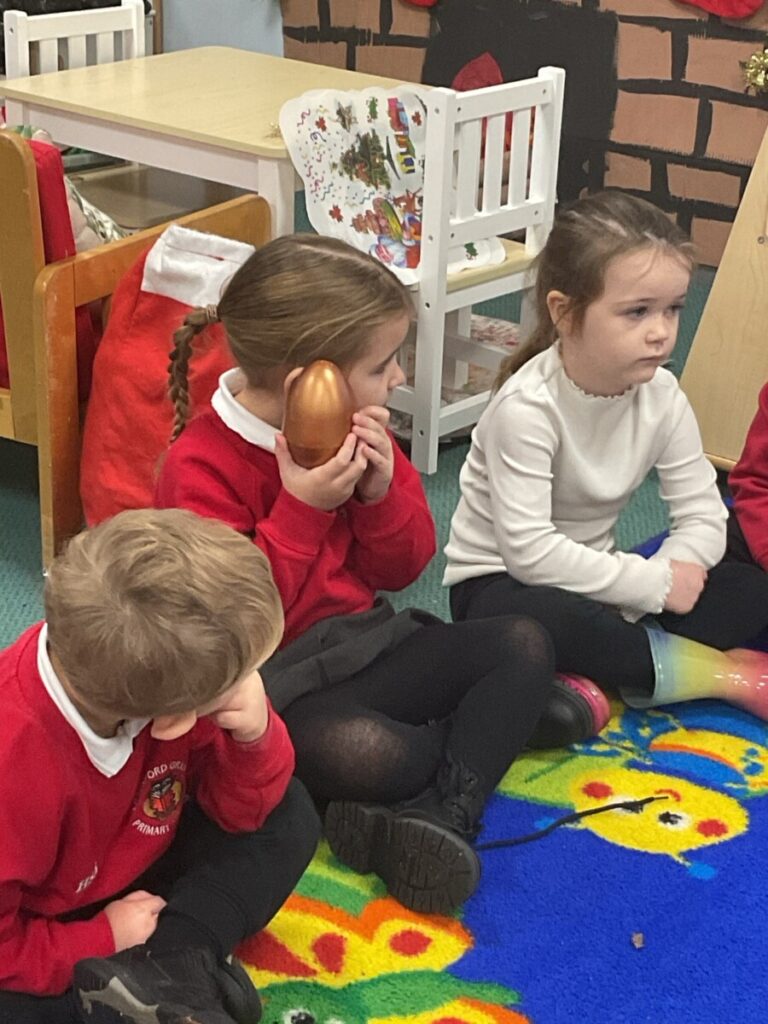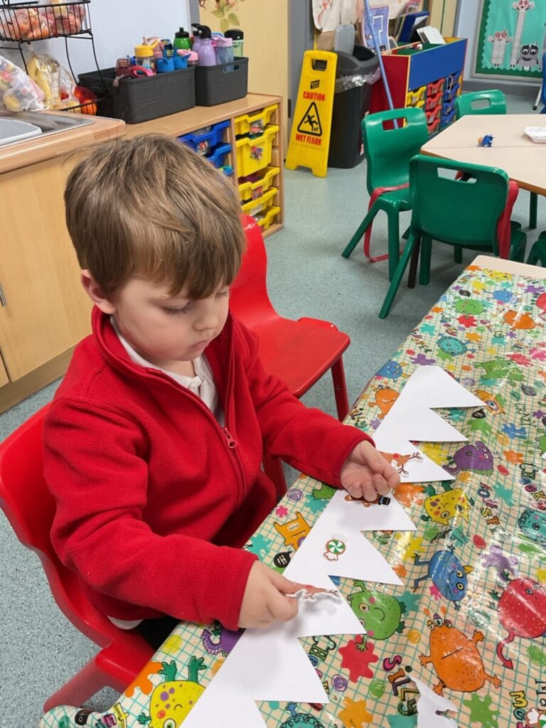 Nursery had a brilliant week creating Christmas crowns for our upcoming party, using repeated patterns with gingerbread men, sweets, stars and other festive stickers. The children also investigated mysterious eggs and made predictions about what might be inside!