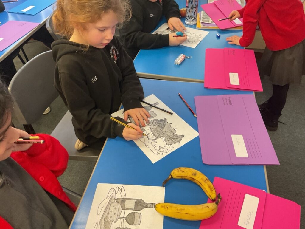 The children began by experimenting with different pencils, discovering how light and dark tones can be created by changing pressure and pencil type. They practised simple shading techniques such as light and dark shading, blending, and layering, helping them understand how artists show form and texture. KS1 children focused on basic shading and recognising light and dark areas, while KS2 pupils developed more detailed shading to show shape, contrast, and depth.
